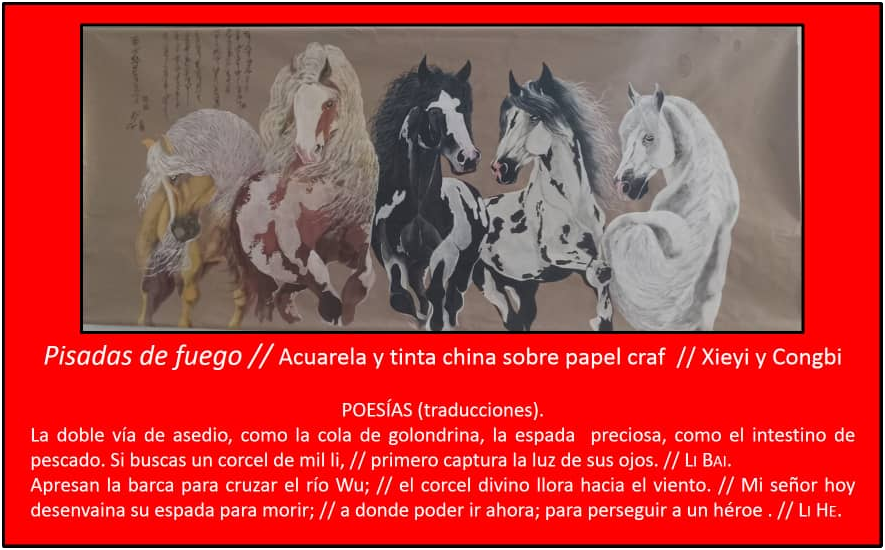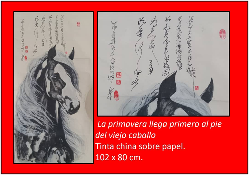 Pisadas de fuego a ritmo de tinta, expo de Alexis González Carbonell, está abierta al público en la Casa de Artes y Tradiciones Chinas en conmemoración a la Fiesta de Primavera o Nuevo Año Lunar. Acercarse a ella desborda la despedida a la Serpiente de madera y el advenimiento del Caballo de fuego en la cultura astrológica china, para desde sus detalles pictóricos expresar cuán importante son sus aportes a la identidad de los cubanos.