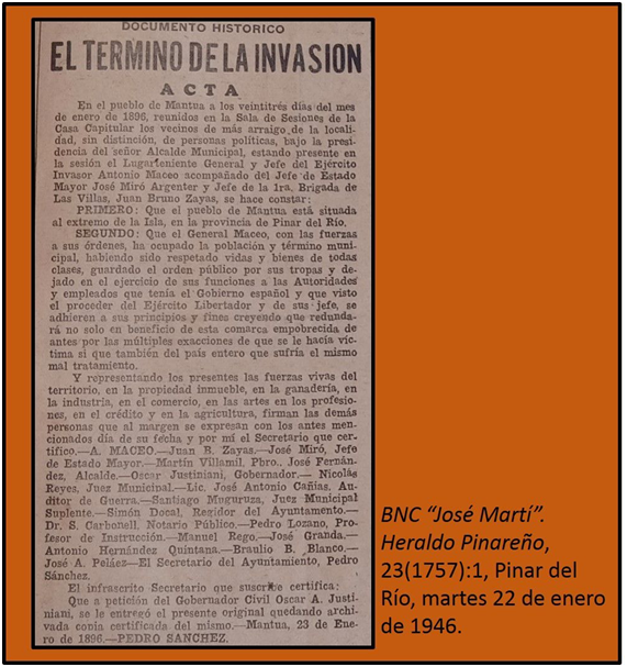 [27] "Acta de la sesión del Ayuntamiento de Mantua, el 23 de enero de 1896, episodio final de la invasión", Heraldo de Cuba, La Habana, 20 de mayo de 1929; en Oficina del Historiador de la Ciudad, Biblioteca Histórica Cubana y Americana "Francisco González del Valle" y Fondo Emilio Roig de Leuchsenring, t. 60, p. 85. https://repositoriodigital.ohc.cu/s/repositoriodigital/item/6215. [15-2-2026].