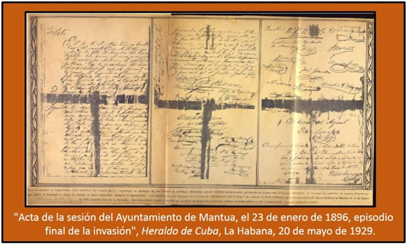 Este documento de inapreciable valor histórico en nuestra patria constituye un obsequio de una familia de abolengo libertador, que ha recibido recientemente, estimando en lo que vale, el General Machado. A un rasgo de gentileza de nuestro Presidente que nos lo ha facilitado al objeto de obtener la copia fotográfica, debemos la oportunidad –que agradecerán con nosotros los lectores de Heraldo de Cuba– de insertar el Acta auténtica de la famosa sesión del Ayuntamiento de Mantua el 23 de Enero de 1896, episodio final de la Invasión. Este documento aunque conocido en su texto no había sido publicado todavía en forma gráfica, y por lo tanto puede juzgarse realmente inédito.[27]
