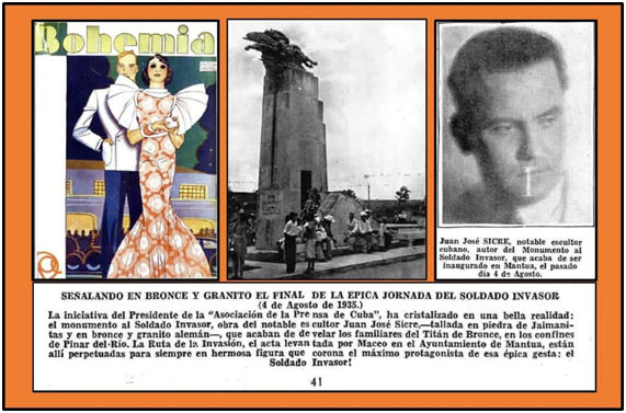Señalando en bronce y granito el final de la épica jornada del soldado invasor. // (4 de Agosto de 1935) // La iniciativa del Presidente de la “Asociación de la Prensa de Cuba”, ha cristalizado en la bella realidad: el monumento al Soldado Invasor, obra del notable escultor Juan José Sicre, -tallada en piedra de Jaimanitas y en bronce y granito alemán-, que acaban de develar los familiares del Titán de Bronce, en los confines de Pinar del Río. La Ruta de la Invasión, el acta levantada por Maceo en el Ayuntamiento de Mantua, están allí perpetuadas para siempre en hermosa figura que corona el máximo protagonista de esa épica gesta: el Soldado Invasor!