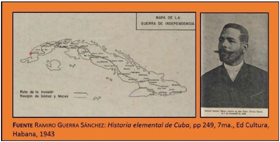 La representación del “acontecimiento mantuano” forma parte sustancial de la Invasión, de ahí que no esté al margen de los textos de Historia de Cuba. El Dr. Ramiro Guerra Sánchez, en Historia elemental de Cuba (1922), interesado en la formación patriótica de la niñez y la adolescencia, dedica un epígrafe al tema, donde califica al Titán de Bronce como “el más famoso de los generales cubanos”, cuya muerte “produjo un dolor profundo en el campo revolucionario”, pues con ello “el Ejercito Libertador perdió el primero de sus generales”; subraya también, que ha sido “sepultado en un sitio llamado Cacahual, donde se ha elevado un monumento a su memoria”;[19] comentario que repercute en la consideración de las construcciones conmemorativas como documentos históricos, a los que deben acudir los maestros en la práctica de visitas y excursiones “suscitando la estimación, fundada y racional, y el amor vivo y ardiente a la patria, sin la cual no se puede ser buen ciudadano, en la más noble, amplia y profunda acepción de la palabra”.[20] Iconográficamente emplea el pedagogo la representación de un mapa de la invasión y una fotografía de su principal protagonista.[21]