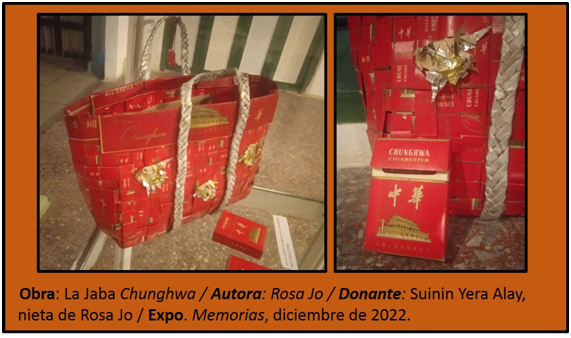 En similar perspectiva, pero donde lo chino se traduce en obra de arte en un lenguaje popular, forma parte de la muestra una Jaba elaborada por Rosa Jo, la china que arribó a la Isla para cumplir con los designios de sus padres: contraer matrimonio con Rufino Alay. De Rosa Jo, la literatura destaca su elevada formación académica y encomiable labor en la inserción de los chinos al contexto cubano y, al mismo tiempo, la necesidad de formar en sus descendientes las bases para mantener vivas las tradiciones chinas. Maestra y creadora, Jo incursionó en la música, en el diseño escenográfico y hasta en las carrozas que representarían a la comunidad en los carnavales habaneros.