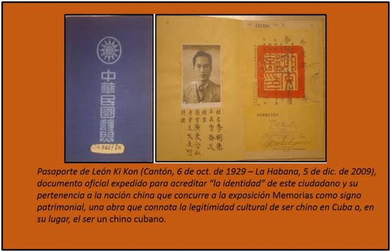 Acompañando el pasaporte de León Ki Kon participaba la tarjeta emitida en abril de 1960 por la Dirección General de Inmigración de la República de Cuba que le acreditaba como chino a los efectos de sus gestiones personales en el territorio nacional, y una fotografía de estudio. Tres reliquias de sus descendientes que, mediante la colaboración de Mario Martínez Delgado, participaron de Memorias. León Ki Kong participó en la guerra chino-japonesa y arriba a Cuba en 1948, donde contrae matrimonio con Isabel Dolores Alemán, madre de sus dos hijos, Víctor y Dolores; socialmente juega un papel importante en la Sociedad On Teng Tong, la que preside durante 10 años.