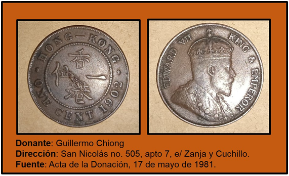 El Acta de la Donación, llenada por Lina E. Grisantti el 17 de mayo de 1981, indica que Guillermo Chiong es vecino de San Nicolás no. 505, 2do piso, apto 7, entre Zanja y Cuchillo, hecho que le ubica en el corazón del Barrio Chino; y que la moneda que aquí se aborda fue donada junto a otras tres, una invitación, cuatro fotografías, una figura de porcelana, un cuadro tejido y un cuadro pintado a mano, muestra que coloca a Guillermo lejos de inscribirse entre los aficionados a tema alguno en materia de coleccionar. ¿Se trata de un grupo de recuerdos personales directamente vinculados a su origen o al gusto familiar?