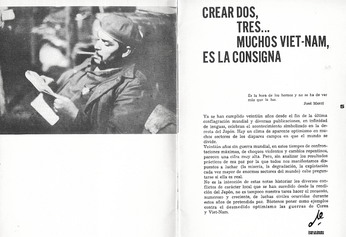 Hay una penosa realidad: Vietnam, esa nación que representa las aspiraciones, las esperanzas de victoria de todo un mundo preterido, está trágicamente solo. Ese pueblo debe soportar los embates de la técnica norteamericana, casi a mansalva en el sur, con algunas posibilidades de defensa en el norte, pero siempre solo. La solidaridad del mundo progresista para con el pueblo de Vietnam semeja a la amarga ironía que significaba para los gladiadores del circo romano el estímulo de la plebe. No se trata de desear éxitos al agredido, sino de correr su misma suerte; acompañarlo a la muerte o la victoria.