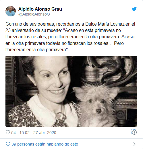 Con uno de sus poemas, recordamos a Dulce María Loynaz en el 23 aniversario de su muerte: "Acaso en esta primavera no florezcan los rosales, pero florecerán en la otra primavera. Acaso en la otra primavera todavía no florezcan los rosales… Pero florecerán en la otra primavera", tuiteó Alonso.