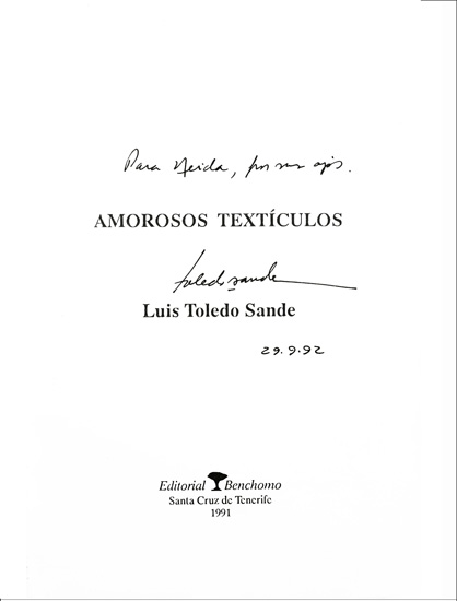 Publicación es a la vez un ejercicio académico del grado que cursa en la Universidad de las Artes, donde dota de un nuevo significado el hecho de destinar de forma íntima un libro que como sabemos, es reproducido generalmente en cuantiosa tirada, presentado en público y adquirido en librerías por cuantiosos y posibles lectores. En este quehacer señala su intención de problematizar la relación entre lo privado y lo público. Así, al agrupar esas dedicatorias en un ejemplar, nos remite a repensar el cómo se individualiza un objeto como el libro, al registrar en este un pensamiento, un deseo o una emoción como dádiva agregada al libro. Ese destino múltiple del libro es trastocado pues, de cierto modo, en un fin personal al sellar con firma o nombre el libro que se dedica a su destinatario.