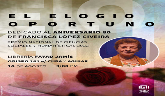 Al aniversario 80 del natalicio de la historiadora y profesora universitaria Francisca López Civeira, Premio Nacional de Ciencias Sociales y Humanísticas 2022, estará dedicado el espacio El elogio oportuno que, conducido por el periodista y crítico Fernando Rodríguez Sosa, se llevará a cabo el jueves 10 de agosto, a las tres de la tarde, en la Librería Fayad Jamís, en Obispo 261 entre Cuba y Aguiar, en el Centro Histórico habanero.
