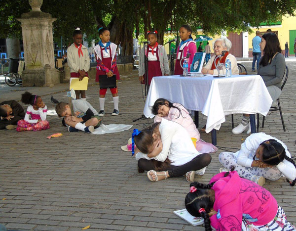 Un grupo de los destinatarios de La Edad de Oro representaron a varios de los personajes de la misma e iniciaron su actuación con una linda adivinanza: Alma de niño tenía/ escribió un libro famoso/ y por eso lo tituló /como un metal precioso.