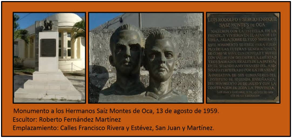 A las personales representaciones del hecho histórico se sumaron varias obras conmemorativas. En el marco del 2do aniversario del vil suceso, en 1959, el Monumento erigido por iniciativa de los estudiantes del Instituto de Segunda Enseñanza de Pinar del Río y el Movimiento 26 de Julio con la colaboración de toda la Provincia; ejecución a cargo del pintor y escultor Roberto Fernández Martínez (Pinar del Río, 3-6-1933-), una obra que si bien apuesta por el realismo como lenguaje para su directo consumo, responde al contemporáneo objetivo de “erigir los recordatorios de acontecimientos reales, vivenciados y sufridos, en los sitios originarios, en el marco verídico de la acción; en antítesis con la idea del «monumento» levantado en el centro de la plaza principal de la ciudad”.[17]