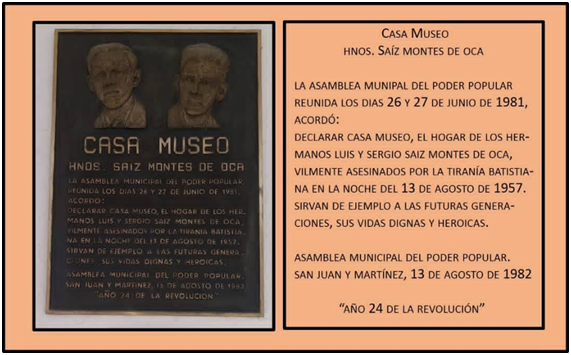 En esta casa, construida en el año 1948, vivieron los hermanos Luis y Sergio Saíz Montes de Oca, destacados organizadores del Movimiento 26 de Julio en el territorio. En su vivienda se guardaban armas, pertrechos y los primeros ejemplares de la Historia me Absolverá, que ambos hermanos distribuían en La Habana. El 13 de agosto de 1957, en plena adolescencia, Luis y Sergio fueron vilmente asesinados por la tiranía batistiana. Luego de su muerte la casa quedó detenida en el tiempo, para perpetuar la memoria de estos jóvenes que desafiaron la muerte a edad tan temprana. // El 13 de agosto de 1982, el matrimonio Saíz Montes de Oca donó su vivienda al Estado cubano para organizar en ella un museo que expusiera la vida de los Hermanos Saíz y pasara a formar parte del patrimonio histórico-cultural. El proyecto de esta institución refleja todo el trabajo que se realiza para proteger, conservar y divulgar la vida y obra de estos revolucionarios.[14]