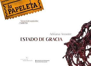 Por segunda ocasión en los últimos cuatro años, la Galería Villa Manuela de la Unión de Escritores y Artistas de Cuba, UNEAC, acoge la obra de la artista visual Adriana Arronte (La Habana, 1980), esta vez con una exposición que, bajo el título de Estado de gracia, estará abierta al público hasta el 28 de octubre venidero.