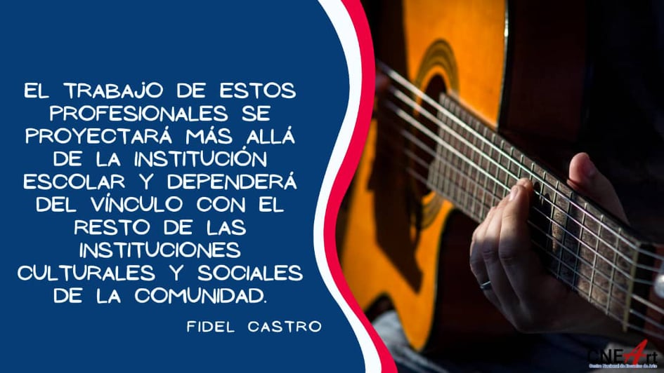 El sueño de Fidel incluye la formación de artistas comprometidos, profundamente, con la liberación humana e identificados con las mejores causas de la época; sujetos activos en las transformaciones de su entorno y precisamente esta se convierte en la misión fundamental del Centro Nacional de Escuelas de Arte, desde la organización, el control, y la ejecución del perfeccionamiento continuo de la enseñanza del arte. Sin embargo este espacio rector de la Enseñanza Artística en Cuba se encarga además de la realización de investigaciones, eventos artísticos y científicos entre otras acciones que desde la labor de los distintos departamentos hacen extensivo el arte de enseñar el arte.